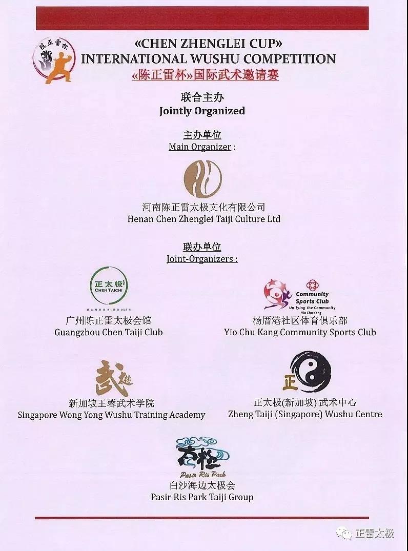 本次大赛由河南陈正雷太极文化有限公司主办,广州陈正雷太极会馆、杨厝岗社区体育俱乐部、新加坡王蓉武术学院、正太极新加坡武术中心、新加坡白沙海边太极会协办。在这里向所有付出辛勤劳动的协办单位致以真诚的感谢和敬意!