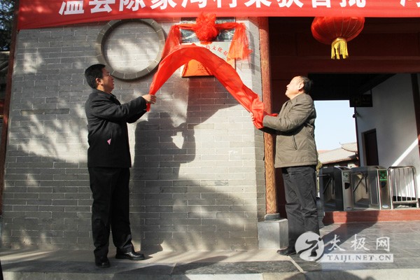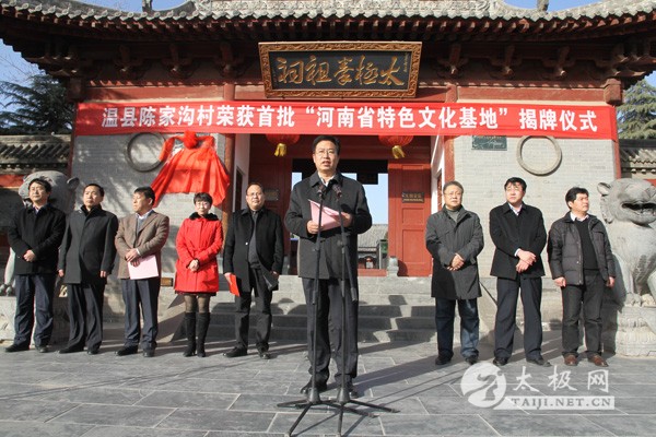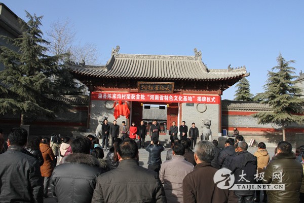 12月31日下午,陈家沟村“河南省特色文化基地”揭牌仪式在太极拳祖祠门前举行,市委常委、宣传部长甘茹华,市委宣传部副部长张少波、市文广新局局长王东林、市文联主席庞宏,县领导李英杰、黄腾、冯志斌、史连更、张金太、严双军出席揭牌仪式。